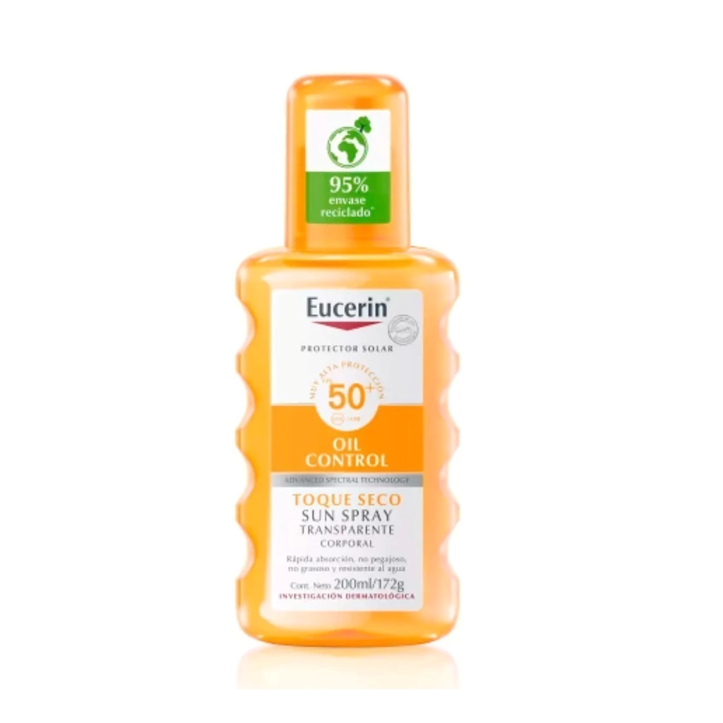 Eucerin Sun Spray Transparente FPS 50 es un protector solar avanzado en spray que no deja residuos visibles en la piel. Para pieles normales y grasas. Ideal para la piel con vello o para usar sobre el cuero cabelludo, con o sin cabello. Esta fórmula solar en spray brinda protección efectiva contra los daños en la piel inducidos por el sol: