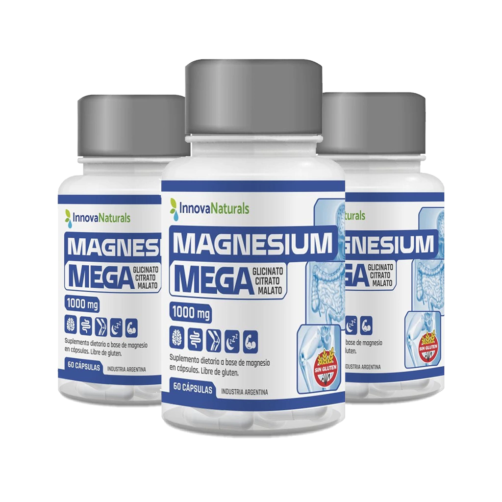¿Qué es el MAGNESIO (Mg)? Es un mineral, micronutriente indispensable para mantenernos sanos. El 60% de los 30g de Mg del organismo se encuentra formando parte de la estructura ósea; posee actividad enzimática, indispensable para más de 300 reacciones enzimáticas; participa en la transmisión y actividad neuromuscular. Consumos elevados de calcio, proteínas, vitamina D, alcohol, así como el estrés psicológico y el esfuerzo físico elevan los requerimientos de Mg. FORMAS DE USO: Consumir dos cápsulas diarias, preferentemente antes de las comidas con abundante agua. La porción diaria aporta: magnesio 1000 mg INGREDIENTES: Cada capsula de 603 mg contiene: Glicinato de magnesio, citrato de magnesio, malato de magnesio, estearato de magnesio (lubricante), cápsula de gelatina dura N.º 0 Sin TACC