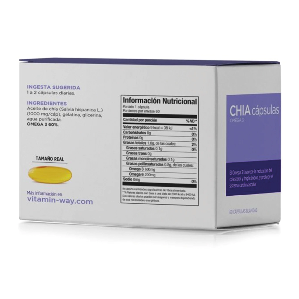 El suplemento nutricional Chía cápsulas Vitamin Way® aporta Omega 3 y Omega 6. El Omega 3 favorece la reducción del colesterol y triglicéridos, y protege el sistema cardiovascular. El consumo de aceite de chía en cápsulas supera ampliamente a la cantidad de Omega 3 que se puede obtener del consumo directo de las semillas trituradas.